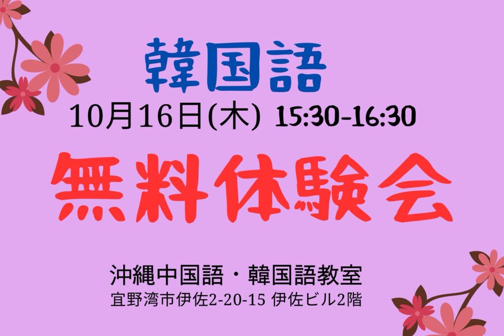 沖縄中国語教室の先生日記2025年10月5日韓国語無料体験会のご案内★開催日10月16日 参加者募集